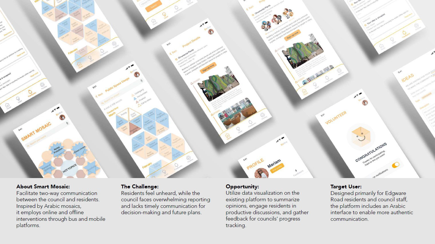 Smart Mosaic is a communication platform and data visualisation system designed to foster more engaged discourse between Westminster City Council and the Edgware Road community. Smart Mosaic emerged as the winner selected by Westminster Council with funding. We presented the concept for future development to cabinet members during the follow-up placement.
