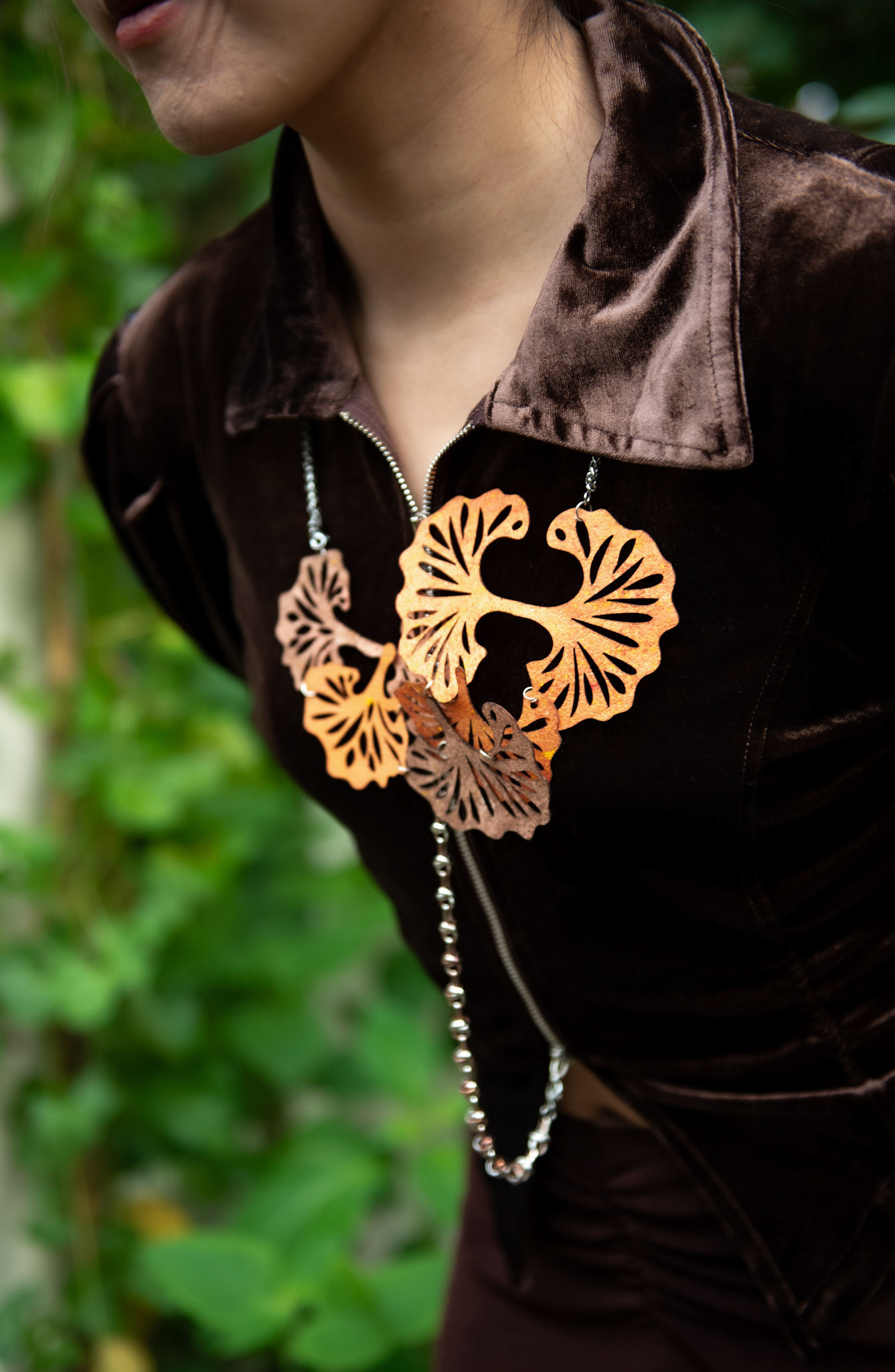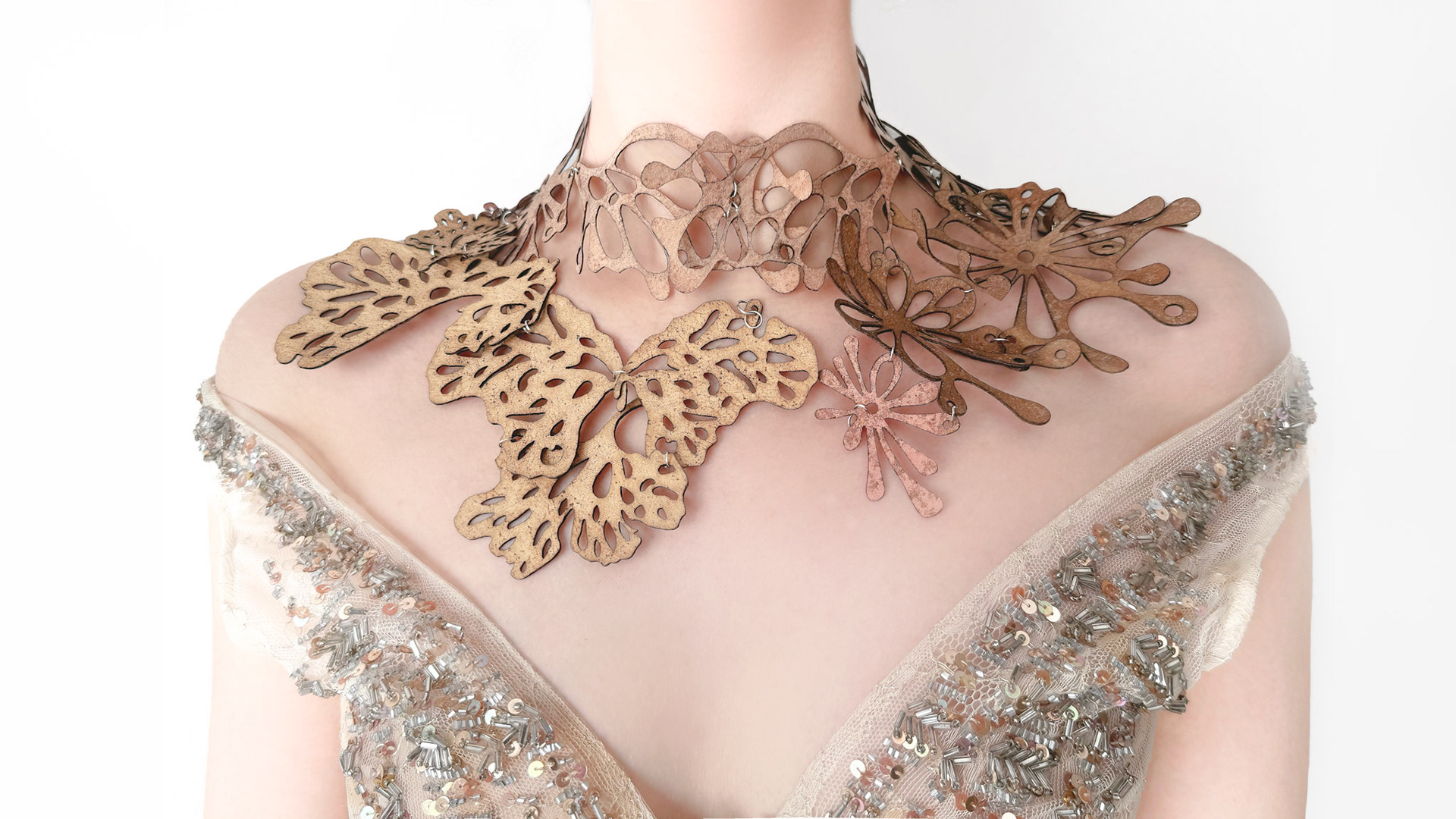 Each Mycelium Lace piece is shaped in collaboration with Mermaid Lucia in London, where biobased frameworks, hand-finishing techniques and fungal cultivation come together. The final objects carry both the delicacy of jewellery and the rawness of biological formation, merging craft precision with the unpredictable intelligence of living matter.